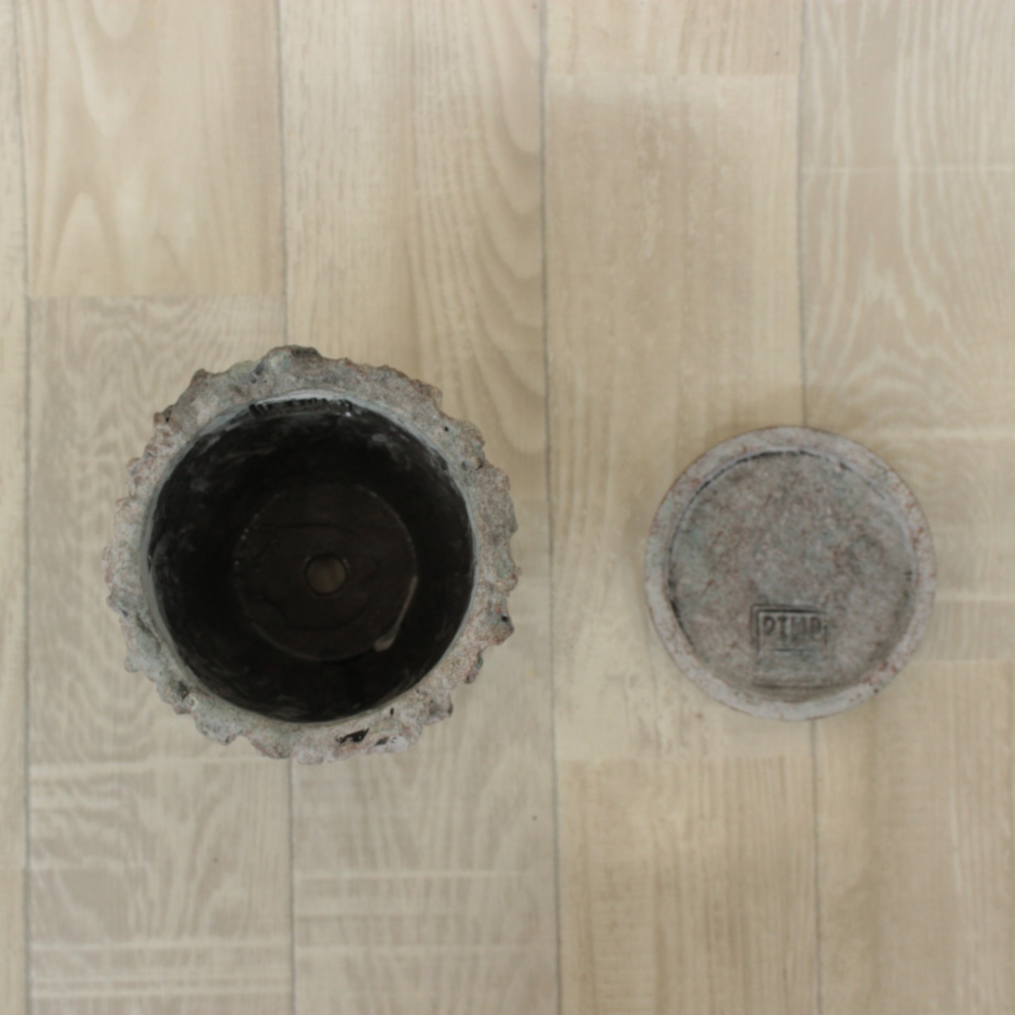 岩から削り出したようなテクスチャーがユニークなセメントポット。 2サイズでの展開です。底穴あり、ソーサー付き。